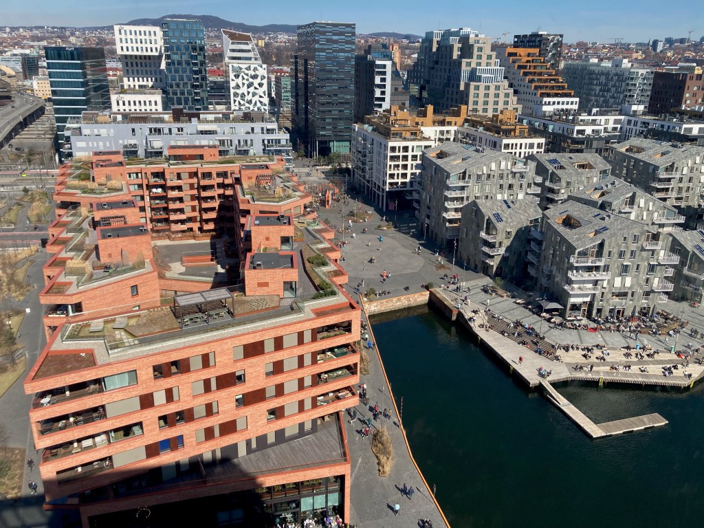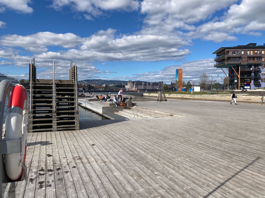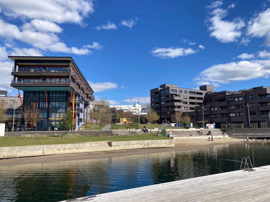 Balade dans le quartier neuf de Sørenga, ou de nombreuses habitations très récentes à l’architecture audacieuse débouchent sur une « plage » ou les habitants ont leurs habitudes de baignade en toutes saisons…