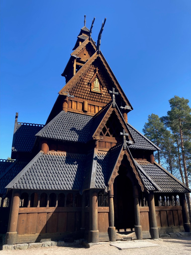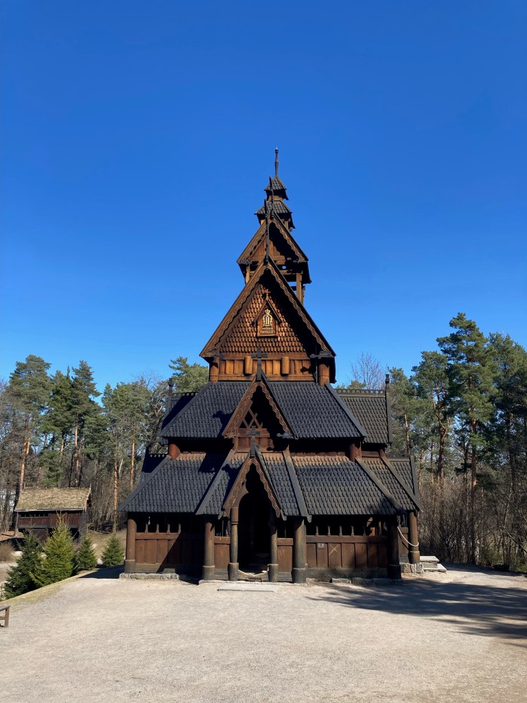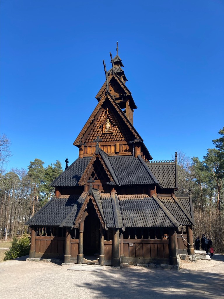 A Bydgøy, quartier très résidentiel d’Oslo, nous visitons le Norsk Folkmuseum, en grande partie un musée de plein air riche de plus de 150 constructions traditionnelles et d’une splendide église en bois debout (stavkirke). Celle-ci a été construite au 13è siècle à Gol, au nord d’Oslo puis déplacée dans ce musée en 1884 afin de la protéger, il ne reste plus qu’une grosse vingtaine d’églises en bois debout en Norvège.