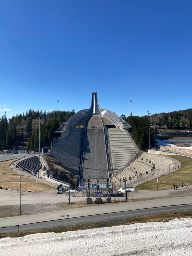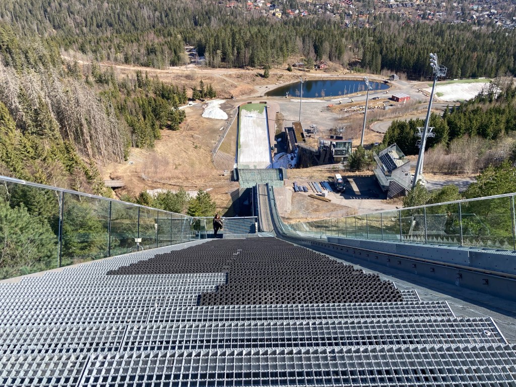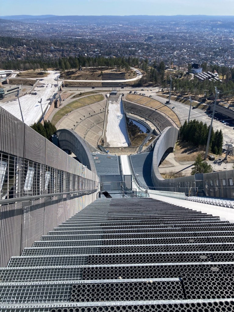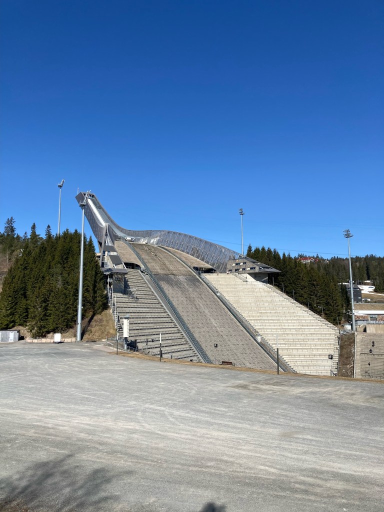 Le soleil étant toujours de la partie, nous sommes partis prendre l’air sur les hauteurs d’Oslo, dans la station de ski et ski de fond qui domine la ville : Holmenkollen. Pour nous y rendre, comme le font l’hiver les habitants d’Oslo, rien de mieux que le métro, ligne 1, qui nous y amène en 40 minutes. La haut, à un peu plus de 300m d’altitude, nous découvrons le tremplin de saut à ski (Holmenkollbakken) inauguré en 1892 et reconstruit, modernisé à de nombreuses reprises, dont la dernière en 2009. Le public vient nombreux (30 000 spectateurs) chaque année y suivre les compétitions internationales. La hauteur du tremplin est de 134 mètres. Le record actuel sur le tremplin est de 141 mètres détenu par l’Autrichien Andreas Kofler en 2011. Juste à côté se trouve le stade de biathlon qui a clôturé la saison internationale 2021-2022 il y a quelques semaines. Nous avons visité le Musée du ski sous le tremplin, sommes montés au sommet du tremplin mais n’avons pas pu faire l’incroyable tyrolienne qui part du haut du tremplin, actuellement ouverte uniquement le weekend !