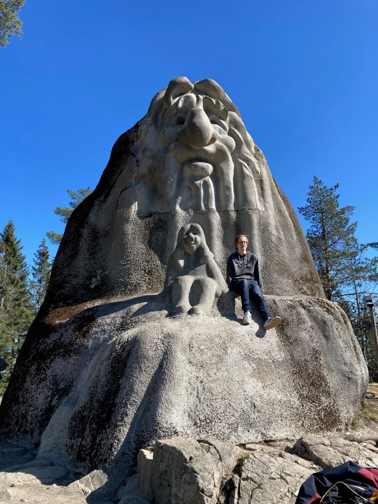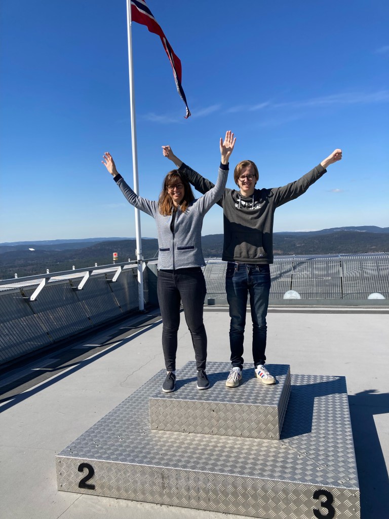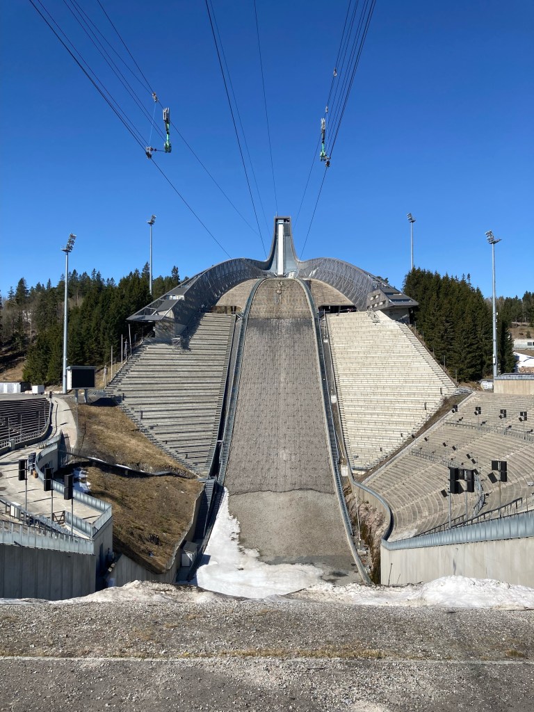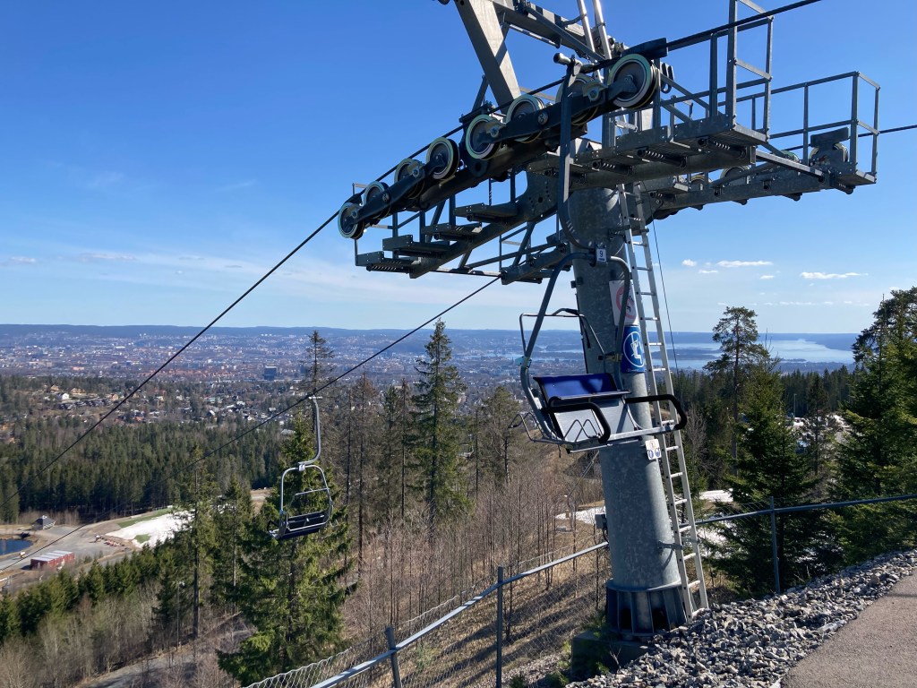 Le soleil étant toujours de la partie, nous sommes partis prendre l’air sur les hauteurs d’Oslo, dans la station de ski et ski de fond qui domine la ville : Holmenkollen. Pour nous y rendre, comme le font l’hiver les habitants d’Oslo, rien de mieux que le métro, ligne 1, qui nous y amène en 40 minutes. La haut, à un peu plus de 300m d’altitude, nous découvrons le tremplin de saut à ski (Holmenkollbakken) inauguré en 1892 et reconstruit, modernisé à de nombreuses reprises, dont la dernière en 2009. Le public vient nombreux (30 000 spectateurs) chaque année y suivre les compétitions internationales. La hauteur du tremplin est de 134 mètres. Le record actuel sur le tremplin est de 141 mètres détenu par l’Autrichien Andreas Kofler en 2011. Juste à côté se trouve le stade de biathlon qui a clôturé la saison internationale 2021-2022 il y a quelques semaines. Nous avons visité le Musée du ski sous le tremplin, sommes montés au sommet du tremplin mais n’avons pas pu faire l’incroyable tyrolienne qui part du haut du tremplin, actuellement ouverte uniquement le weekend !