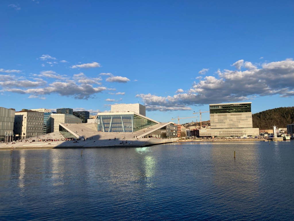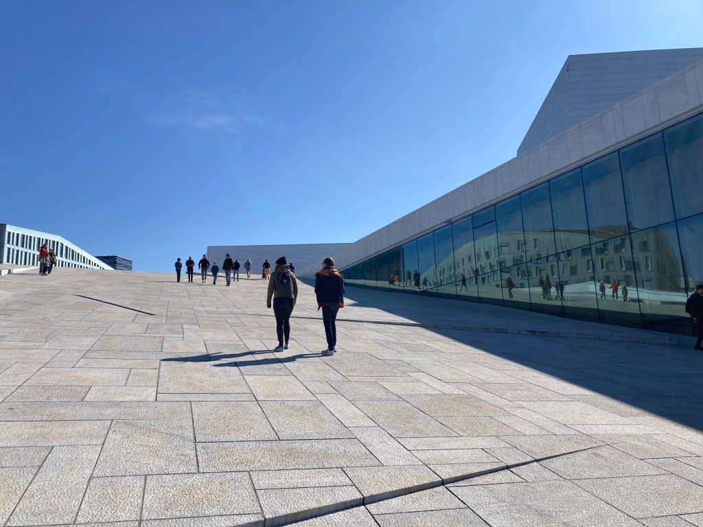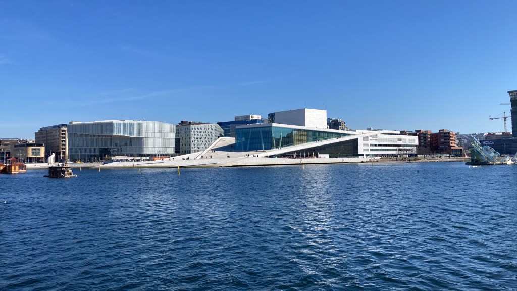 Arrivés au fjord, le premier bâtiment qui se distingue est l’Opéra, inauguré en 2008, sur lequel il est possible de monter ce qui permet de surplomber la baie…