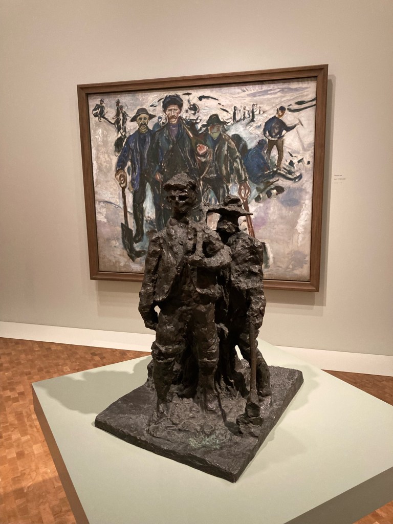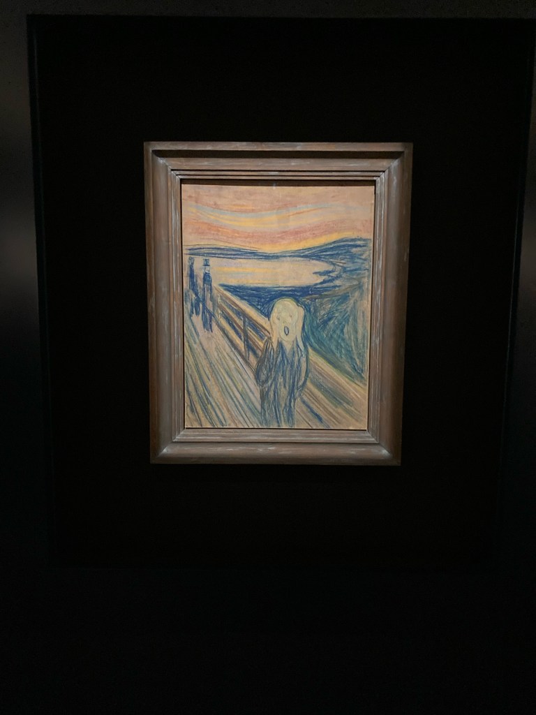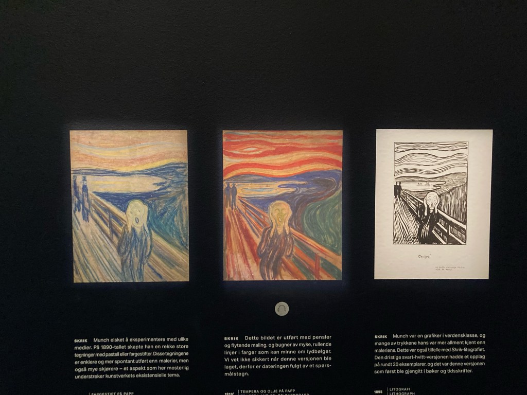 Visite du Musée Munch le matin, un superbe bâtiment qui domine le fjord, haut de 60m, 12 étages. On y trouve le travail du peintre, une reconstitution de son domicile, de sa vie, ainsi que des oeuvres de divers grands artistes (Dali, Breton, Miró…).