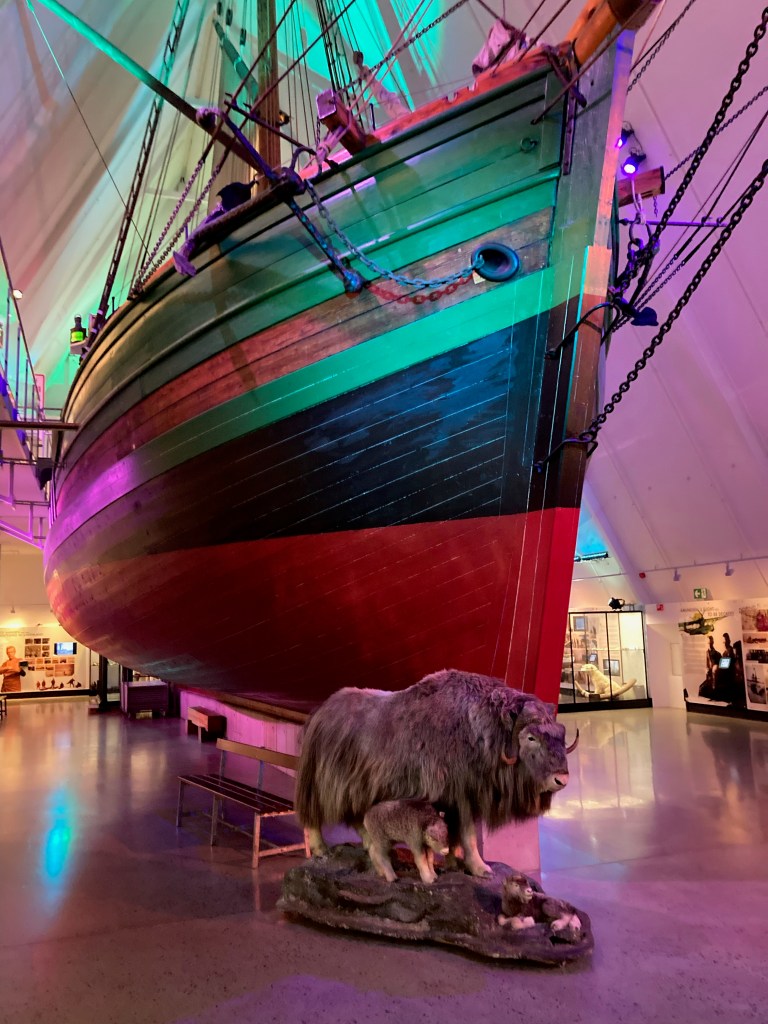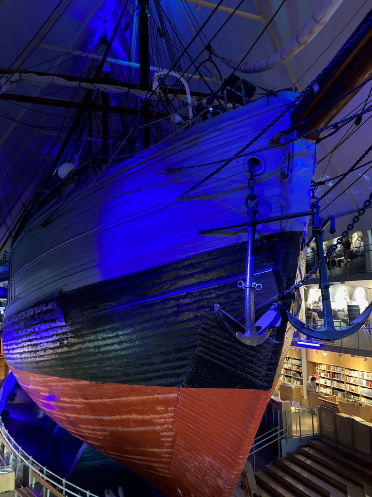nous sommes allés visiter le Frammmuseet , qui retrace les expéditions polaires des grands navigateurs norvégiens, notamment Roald Amundsen et Fridtjof Nansen. Les deux bâtiments du Musée sont construits autour des bateaux des deux principales expéditions : le Fram et le Gjøa (ce qui fait penser au Musée Vasa de Stockholm). Les deux bateaux se visitent et sur les étages autour des bateaux on retrouve de nombreuses photos, objets, et explications sur ces expéditions polaires.
